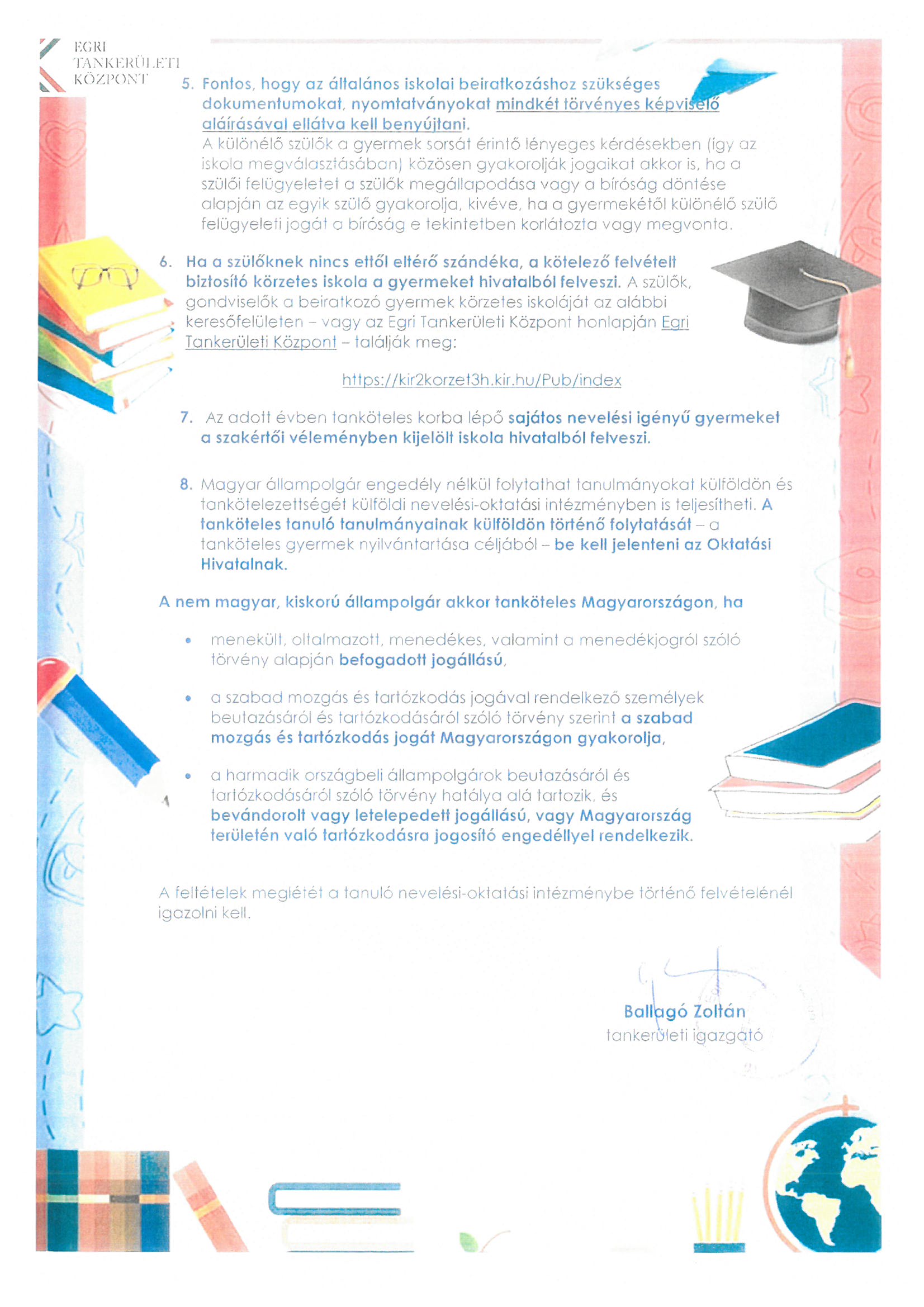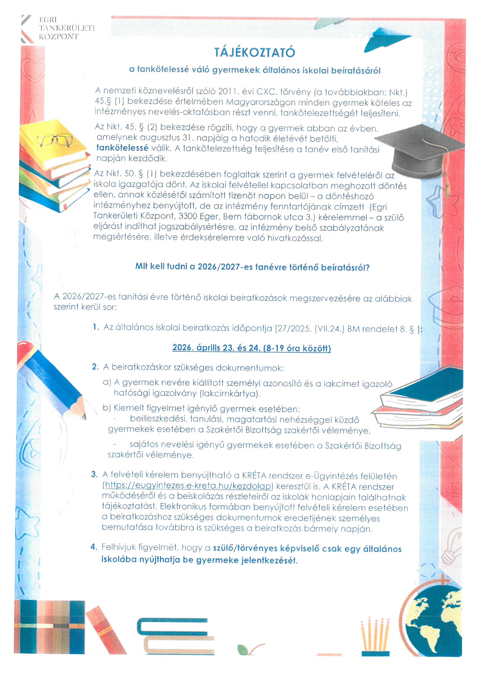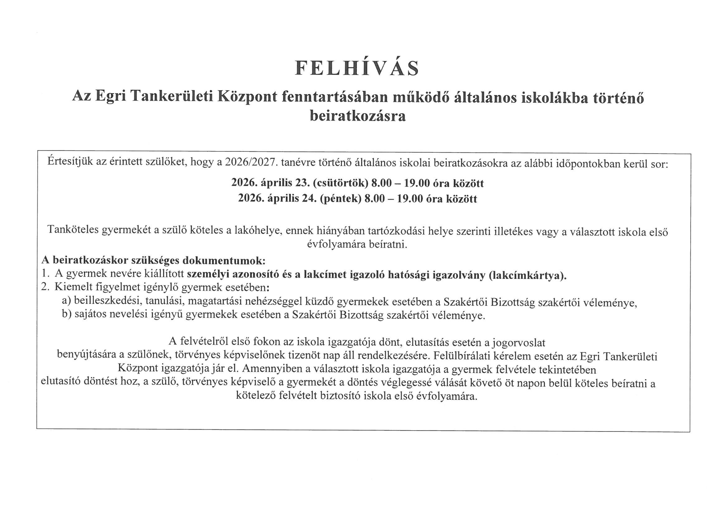Felhívás általános iskolába történő beiratkozásra Létrehozva: 2026. 03. 13. 2026. április 23-24. Egri Tankerületi Központ illetékességi területén lévő általános iskolák felvételi körzethatára 2026-2027. tanév