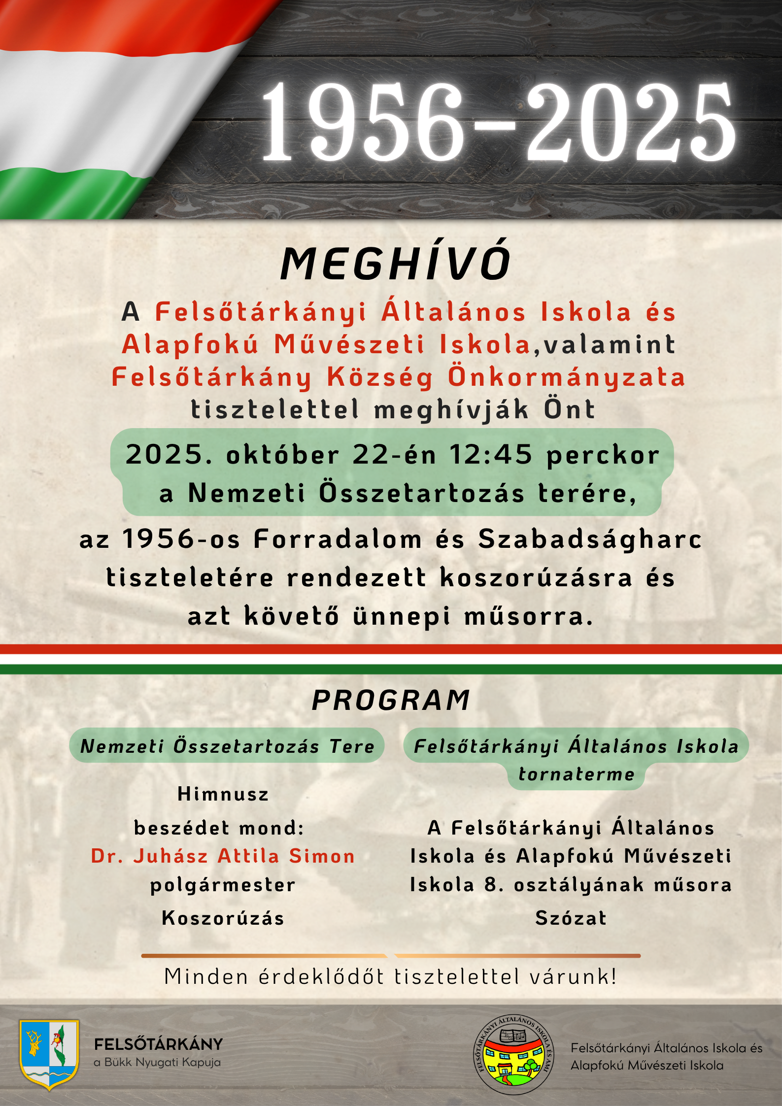 A Felsőtárkányi Általános Iskola és Alapfokú Művészeti Iskola,valamint Felsőtárkány Község Önkormányzata tisztelettel meghívják Önt 2025. október 22-én 12:45 perckor a Nemzeti Összetartozás terére, az 1956-os Forradalom és Szabadságharc tiszteletére rendezett koszorúzásra és azt követő ünnepi műsorra, melynek helyszíne a Felsőtárkányi Általános Iskola és Alapfokú Művészeti Iskola tornaterme.