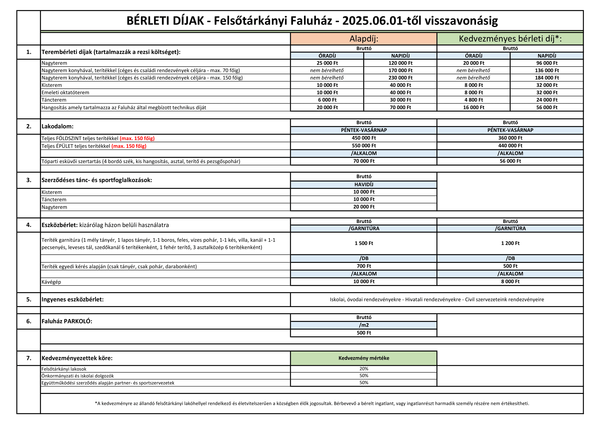 A Felsőtárkányi Faluház bérleti díjai. Érvényes 2025. június 1-től visszavonásig.
