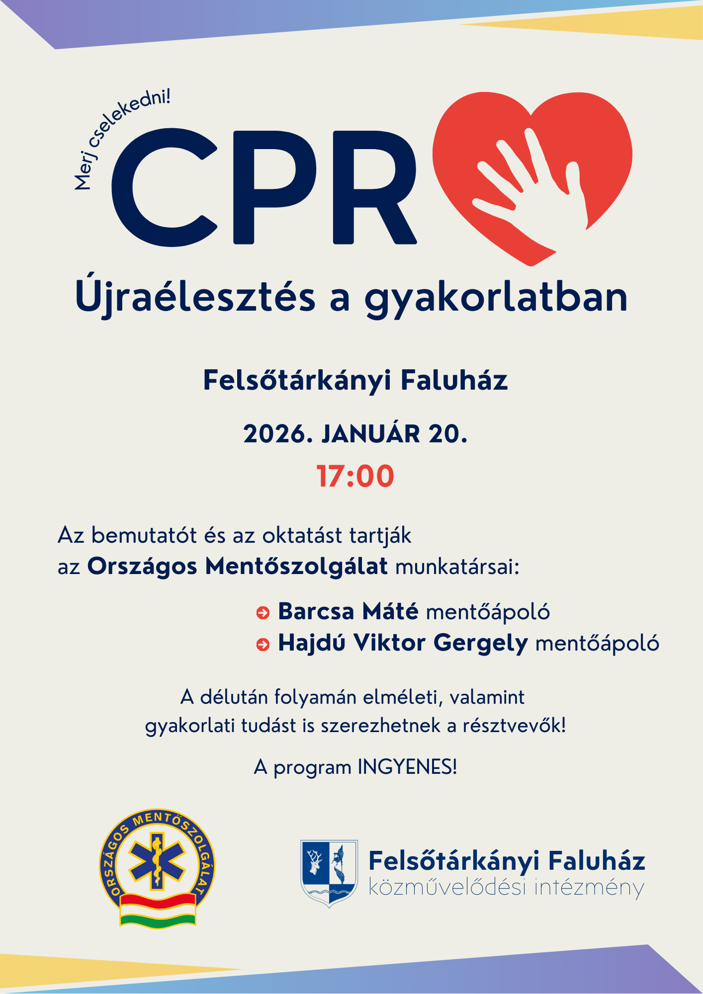 Az bemutatót és az oktatást az Országos Mentőszolgálat munkatársai tartják: Barcsa Máté és Hajdú Viktor Gergely mentőápolók. Elméleti és gyakorlati alkalom, hogy segíteni tudj a bajban! 2026. január 20-án várunk mindenkit 17:00 órai kezdettel a Felsőtárkányi Faluházba.